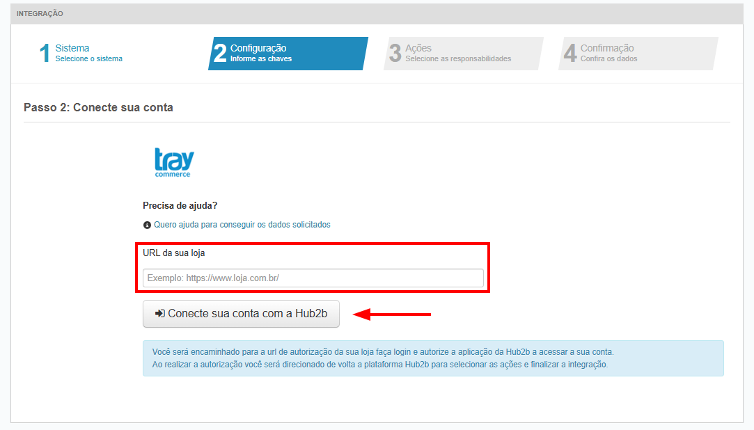 3. No Passo 2, insira o domínio da sua loja da Tray e clique no botão Conecte sua conta com a Hub2b.