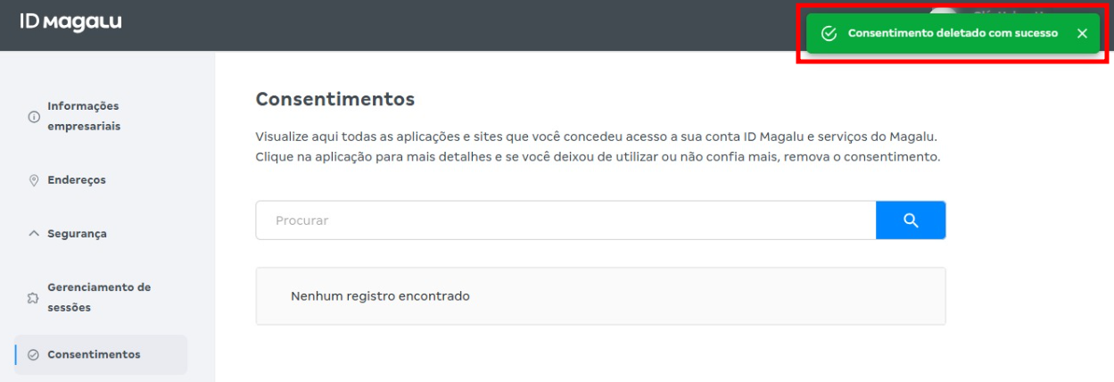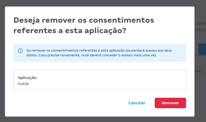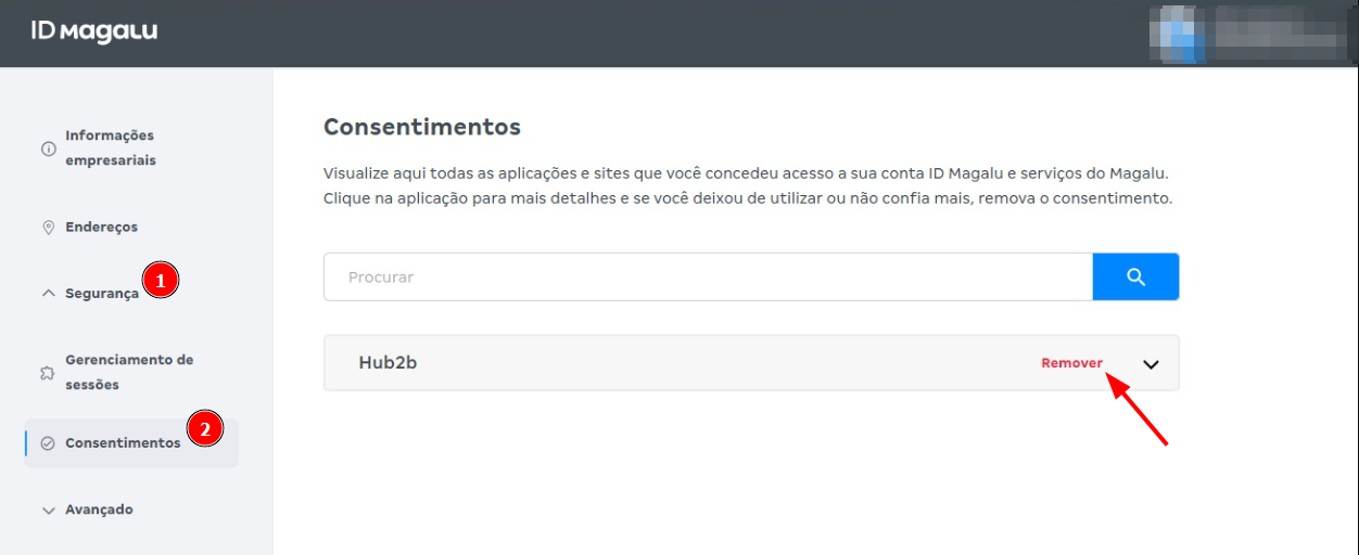 2. No menu lateral, acesse Segurança > Consentimentos. Na tela exibida, verifique se existe algum consentimento ativo para a Hub2b. Caso exista, clique no botão Remover para excluir o consentimento da integração.