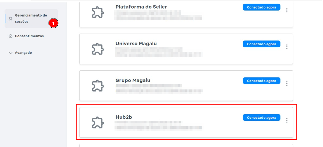 3. Em seguida, acesse Segurança > Gerenciamento de sessões. Localize uma sessão intitulada Hub2b. Se encontrada, clique nos três pontinhos ao lado da sessão e selecione Desconectar sessão, encerrando a sessão antiga.