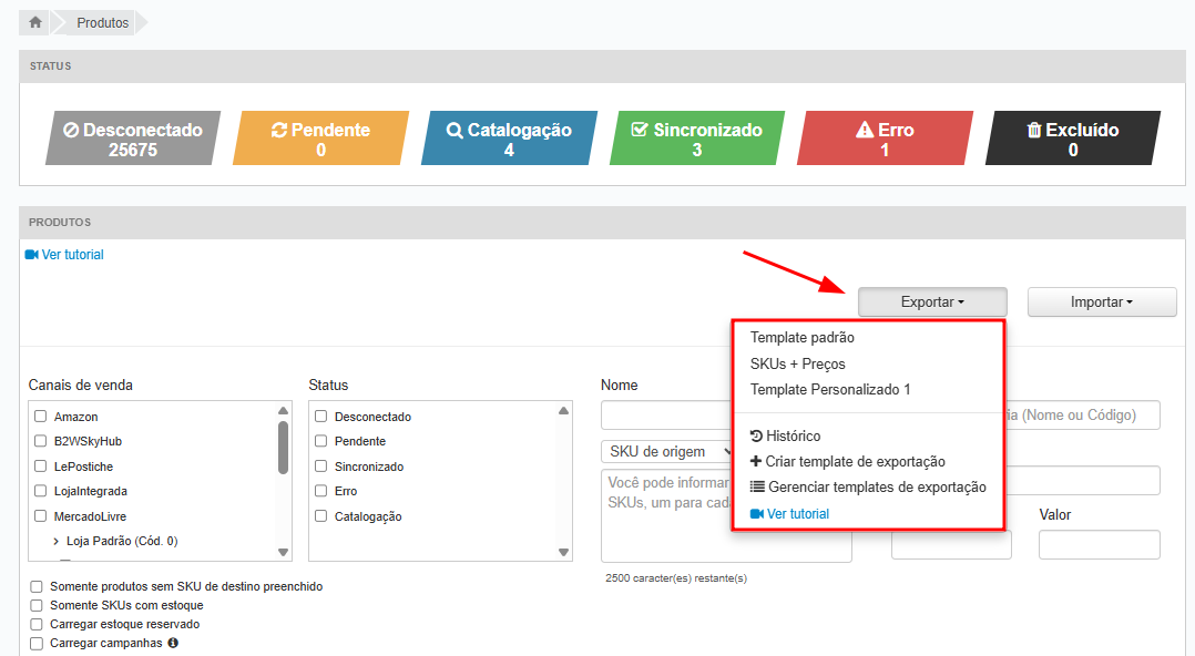 Para acessar a funcionalidade de exportação, no menu principal, acesse Produtos e, em seguida, clique em Exportar.