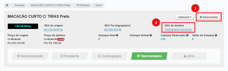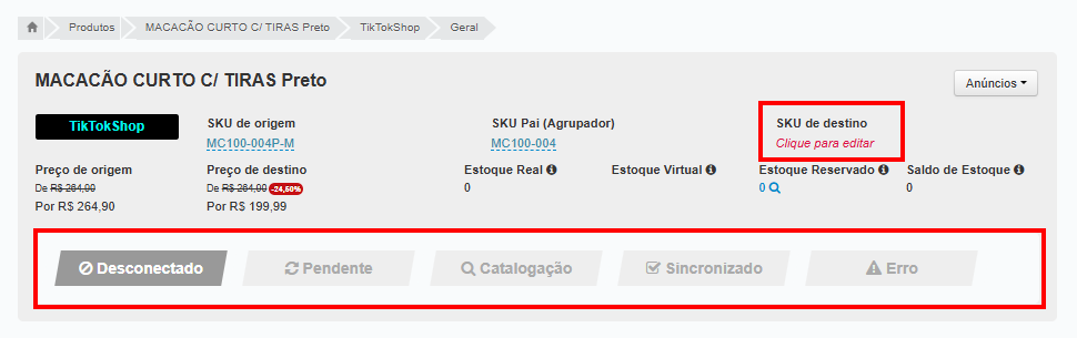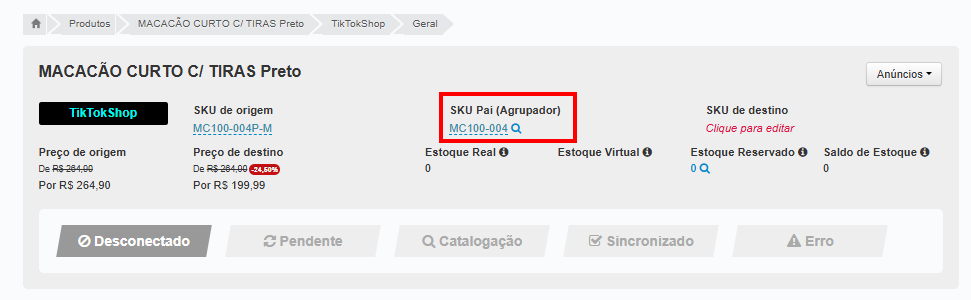 Como o código do anúncio é diferente (código antes do hífen), esse SKU pertence a outro anúncio no TikTok.