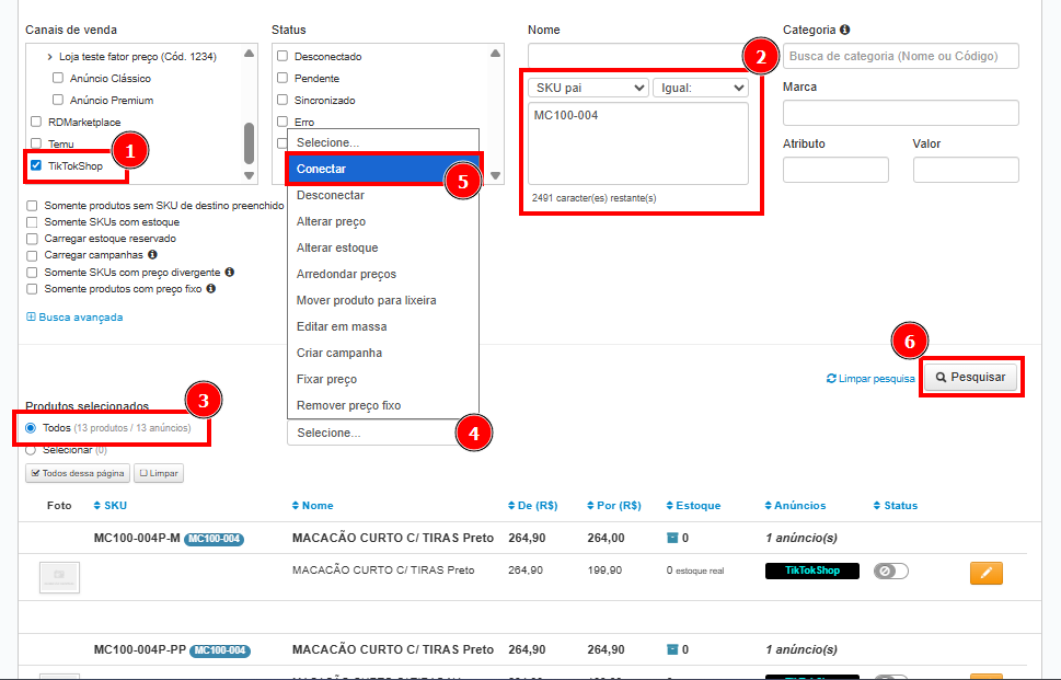 1.1 Localize o anúncio no TikTok utilizando o código do anúncio, presente no SKU de Destino da Hub2b