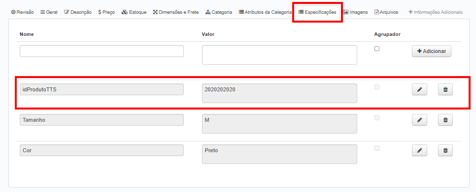 2.3 Acesse a aba Especificações e insira o seguinte atributo: